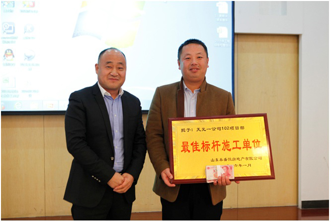 會上,公司副總經理、質量檢查組組長班磊以PPT的形式,結合各項目日常表現總結分析了2015年度工程檢查中各項目體現的亮點和不足。并對表現突出的金泰華府南地塊27#樓承建單位天元102項目部進行了表彰。